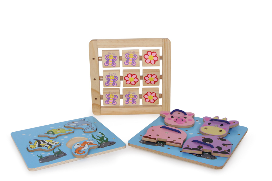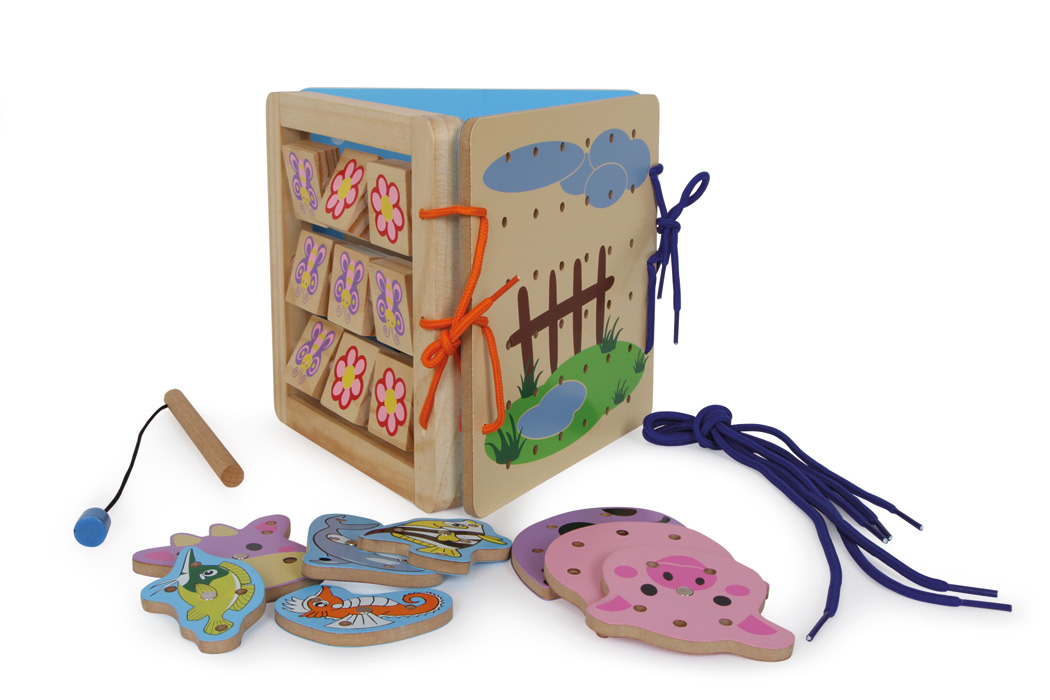 Τριπλή διασκέδαση με άφθονη ποικιλία: Πολύχρωμα ζώα του ωκεανού μπορούν να ψαρευτούν με το μαγνητικό καλάμι ψαρέματος. Το γουρούνι και η αγελάδα πρέπει να περαστούν με κλωστή πάνω στην μπλε ξύλινη βάση και το περιστρεφόμενο παιχνίδι με λουλούδια και πεταλούδες καλλιεργεί τις κινητικές  δεξιότητες. Οι διαφορετικές πλευρές του παιχνιδιού μπορούν να συνδεθούν με 5 νήματα και 8 μαγνητικά στοιχεία.